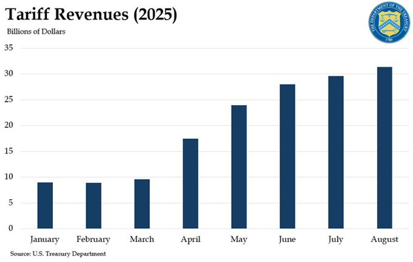 President Trump continues to deliver on his promise to make America wealthy again through tariffs. In August, tariff revenues topped $31 billion — bringing the total to $158 billion this calendar year, or more than 2.5 times the revenue this time last year.