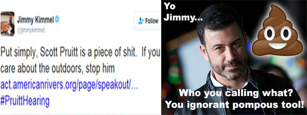 It was January 19, 2017 when this publisher last wrote about Kimmel. Then he was attacking Scott Pruitt and the graphic following shows what Kimmel wrote and I responded. Charlie Kirk would have done better than I, as a follower of Jesus Christ, and moving forward, I hope to improve my responses to stupid evil people – but I’m Scottish, when lacking any other opponent, we tend to battle ourselves.