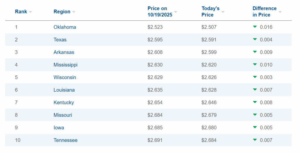 The Top Trends feature of the AAA Fuel Prices website shows Oklahoma with an average price of $2.523 (10/19/2025). Tulsa Today checked major distributors today in Uptown today.