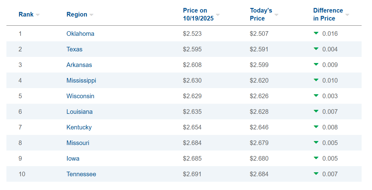 The Top Trends feature of the AAA Fuel Prices website shows Oklahoma with an average price of $2.523 (10/19/2025). Tulsa Today checked major distributors today in Uptown today.