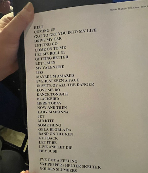 Got Back Tour, Tulsa Song List, Photo: David Arnett