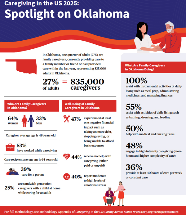 New data released by AARP reveals that 27 percent of adults in Oklahoma, approximately 835,000 people, are family caregivers, providing largely unpaid and unsupported care to aging parents, spouses and other loved ones.