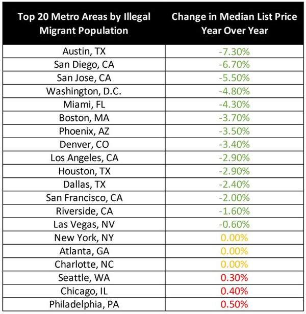 In 14 of the top 20 metro areas with the largest illegal migrant populations, home list prices declined year-over-year in December — and the three metro areas that saw modest price increases are all so-called “sanctuary cities.” Overall, home prices have dropped for the first time in more than two years as as housing affordability shows signs of improvement under the Trump Administration.