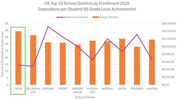 According to the Oklahoma Schools Report Card method of measuring achievement, TPS student grade level proficiency dropped 21%, from 11.3% to 8.9%.