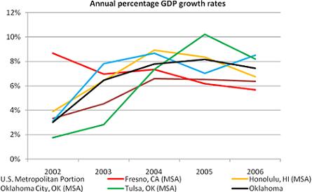 More surprisingly, Oklahoma City’s growth rates experienced a steep fall between 2004 and 2005 exactly at the time when Tulsa experienced a steep rise. Here again, we see that Tulsa outperforms all its sister regions.