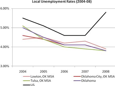 Local unemployment rates have consistently been the lowest in Tulsa among the neighboring areas- Lawton and Oklahoma City. Even when unemployment was shooting up nationally during 2007 and 2008, Tulsa maintained its lowest unemployment rates in almost five years.